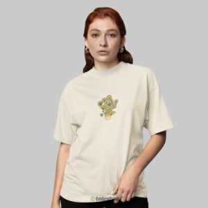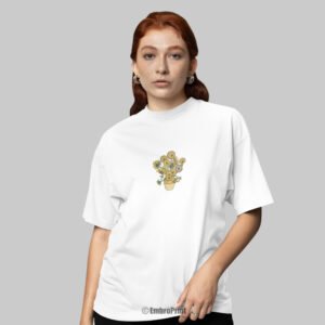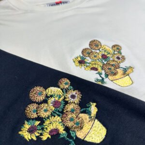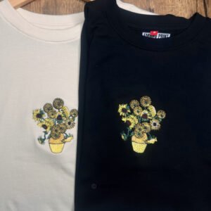 The centerpiece of this tee is the embroidered Sunflower artwork, a tribute to Van Gogh’s bold colors and expressive brushwork — now reimagined in fine thread detailing. Each stitch reflects the warmth and optimism of his art, turning this tee into a wearable canvas of creativity.