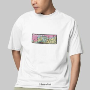 The highlight is the embroidered Japanese Train gliding through Cherry Blossoms, a design that captures the calm elegance of spring in Japan and the timeless connection between tradition and travel. The embroidery is placed on the front of the t-shirt, available in three sizes – 4, 6, and 8 inches – letting you choose between a subtle accent or a bold statement piece.