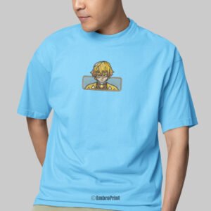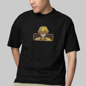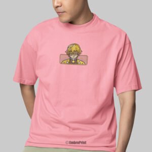 Oversized unisex 240 GSM cotton tee with embroidered Zenitsu Agatsuma design, front (4/6/8 inches) & bold 8-inch back, in 5 colors.